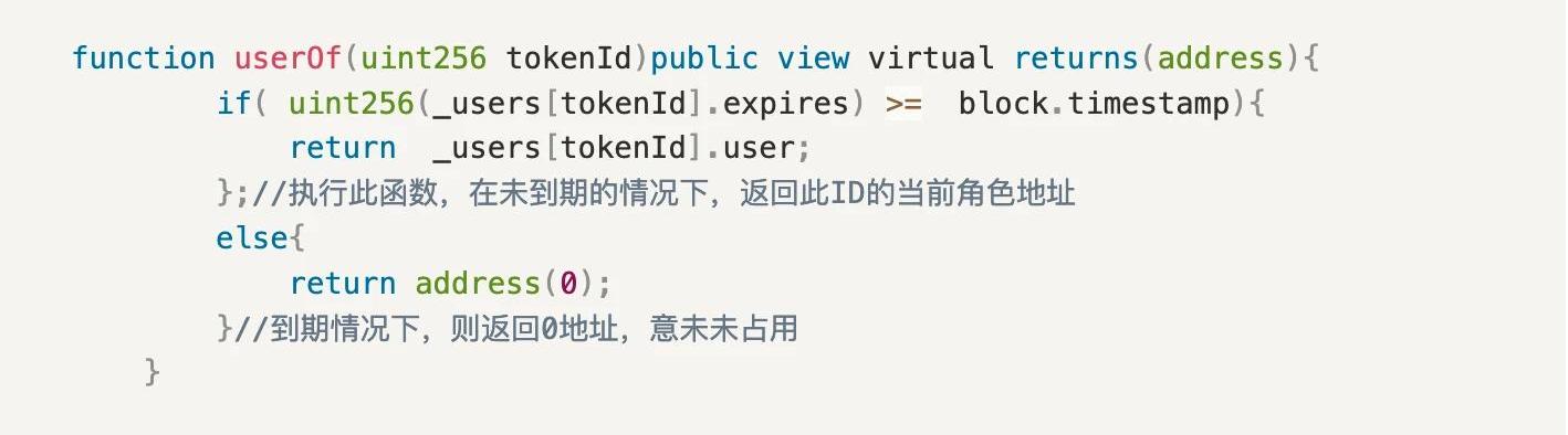 媒體處處宣傳的超時自動失效,而無需二次鏈上交易登記失效節約gas的邏輯就在這了。查詢的邏輯很簡單,按指定的NFTID查詢_users的user信息即可,但他增加了,if判斷,當前塊的時間block.timestamp是否會超過設置的過期時間expires,所以此查詢僅在時間內有效。