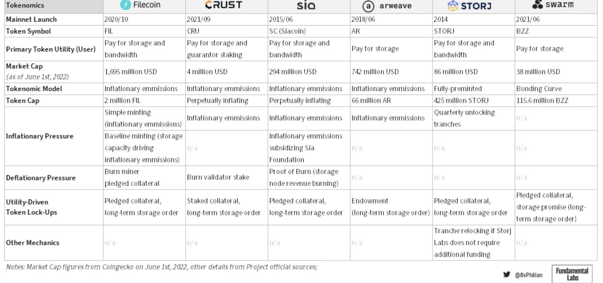 不能說一個網絡在客觀上比另一個網絡更好。在設計去中心化存儲網絡時,存在無數的權衡。雖然Arweave非常適合永久存儲數據,但Arweave不一定適合將Web2.0行業參與者遷移到Web3.0-并非所有數據都需要永久保存。但是,一個強大的數據子領域的確需要永久性:NFT和dApp。最終,設計決策會基于該網絡的目的。以下是各種存儲網絡的總結概況,它們在下面定義的一組尺度上相互比較。使用的尺度反映了這些網絡的比較維度,但是應該注意的是,克服去中心化存儲挑戰的方法在許多情況下并沒有好壞之分,而只是反映了設計決策。存儲參數靈活性:用戶控制文件存儲參數的程度存儲持久性:文件存儲在多大程度上可以通過網絡實現理論上的持久性冗余持久性:網絡通過補充或修復來保持數據冗余的能力數據傳輸激勵:網絡確保節點慷慨傳輸數據的程度存儲跟蹤的普遍性:節點之間對數據存儲位置的共識程度有保證的數據可訪問性:網絡確保存儲過程中的單個參與者無法刪除對網絡上文件的訪問的能力分數越高表明上述各項的能力越強。Filecoin的代幣經濟學支持增加整個網絡的存儲空間,用于以不可變的方式存儲大量數據。此外,他們的存儲算法更適用于不太可能隨時間發生很大變化的數據。