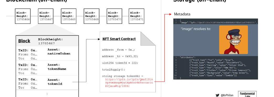 圖3:基于上次銷售的CryptoPunk底價;CryptoPunk圖像大小基于CryptoPunksV2鏈上字節字符串的字節長度。數據截至2022年5月10日。來源:OpenSea、鏈上數據、IPFS元數據NFT并不真正包含任何圖像數據,相反,它們只有指向存儲在鏈下的元數據和圖像數據的指針。但需要保護的正是這些元數據和圖像數據,如果這些數據消失,NFT將只是一個空蕩蕩的容器。