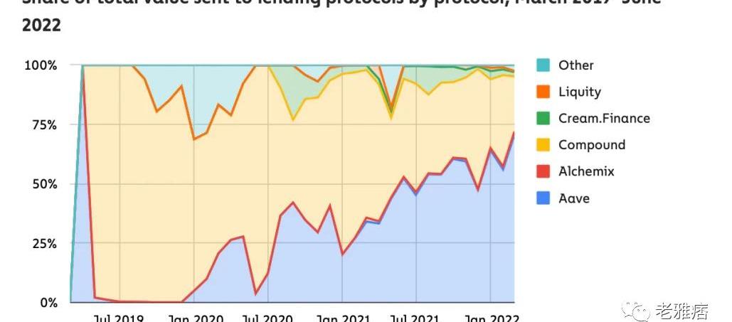 貸款方面呢?Aave和Compound目前控制著借貸平臺的交易量的90%。這里的“其他”類別是所有其他參與競爭的借貸平臺。他們獲得了剩余借貸量的10%以下。人們可以查看這些數據并說,‘DeFi借貸是如此集中’。市場遵循風險投資領域中典型的冪律模式。如果有什么不同的話,考慮到過去幾個月的波動性和清算頻率,這些平臺運行得異常良好。我選擇這些數據集是為了展示DeFi在更多次要協議之間的競爭程度。我想,成為DeFi創始人并不容易。