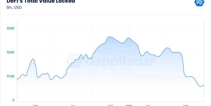 資料來源:DappRadarTerra崩潰對DeFi市場產生巨大影響,導致總鎖倉量跌至2021年初水平,本文撰寫時僅為700億美元左右,比2022年一季度末減少69%,比一年前下降33%。