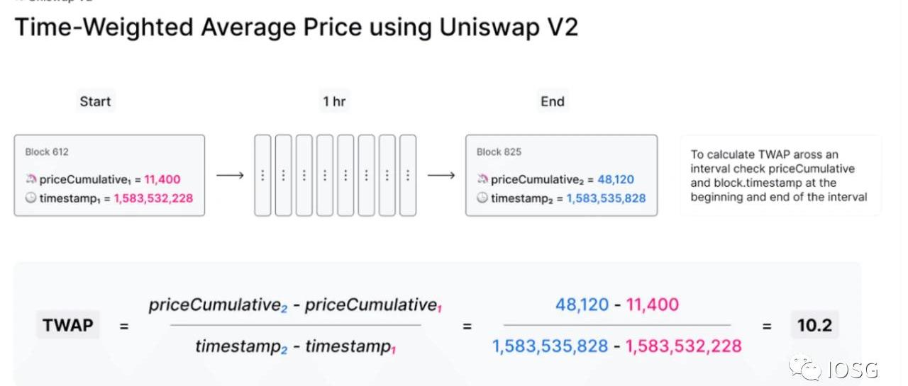 預言機對NFT進行定價評估的典型方式就是基于簡單的傳統算法交易策略,在對NFT銷售價格和底價進行加權平均計算,從而綜合得到一個TWAP(TimeWeightedAveragePrice)。舉一個簡單的例子,如果我們想計算時間間隔為1個小時的TWAP價格,就可以取開始和結束的累計價格P1和P2的差值,以及開始時間T1和結束時間T2的差值,將兩者相除,從而算出這1小時內的TWAP。最為人所熟知的TWAP預言機包括Chainlink和Uniswap的V2。