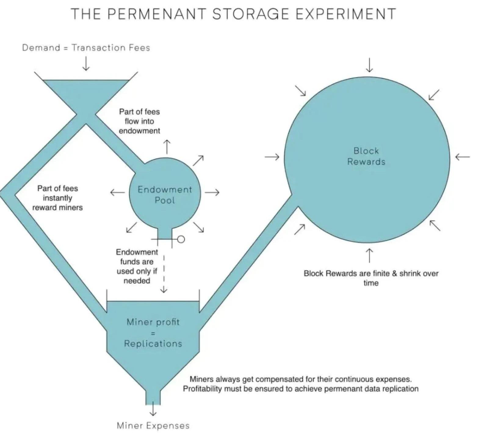 Arweave網絡的核心貢獻者是自愿加入的礦工。礦工愿意永久儲存數據的動力是收益。礦工們的收入主要有兩個來源,一個是網絡手續費,另一個便是區塊獎勵/區塊通脹。網絡手續費的收入來自于14%的用戶付費,這些代幣也將直接成為流通量。剩下約86%將進入捐贈池(endowmentpool),當礦工成本無法覆蓋時,捐贈池中的資金將作為補貼發放給礦工。