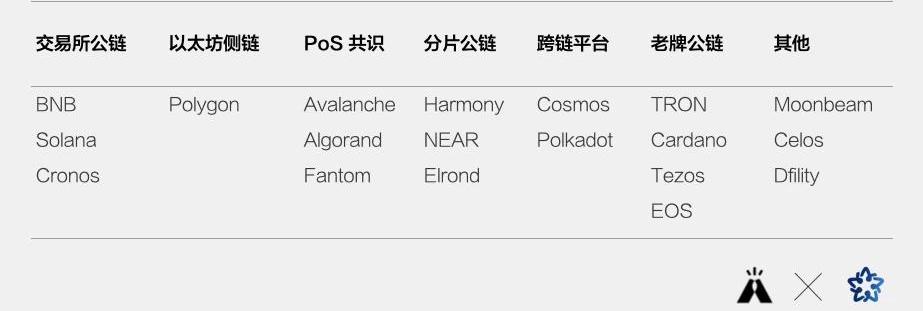 公鏈是加密市場的基礎設施,也是最重要的組成部分。本文所討論的公鏈包括:智能合約平臺和跨鏈平臺,總共21條。除了Ethereum,其他選取樣本及分類如下。樣本選取的標準是市值前100,已建立起自己的生態,具有一定的關注度。