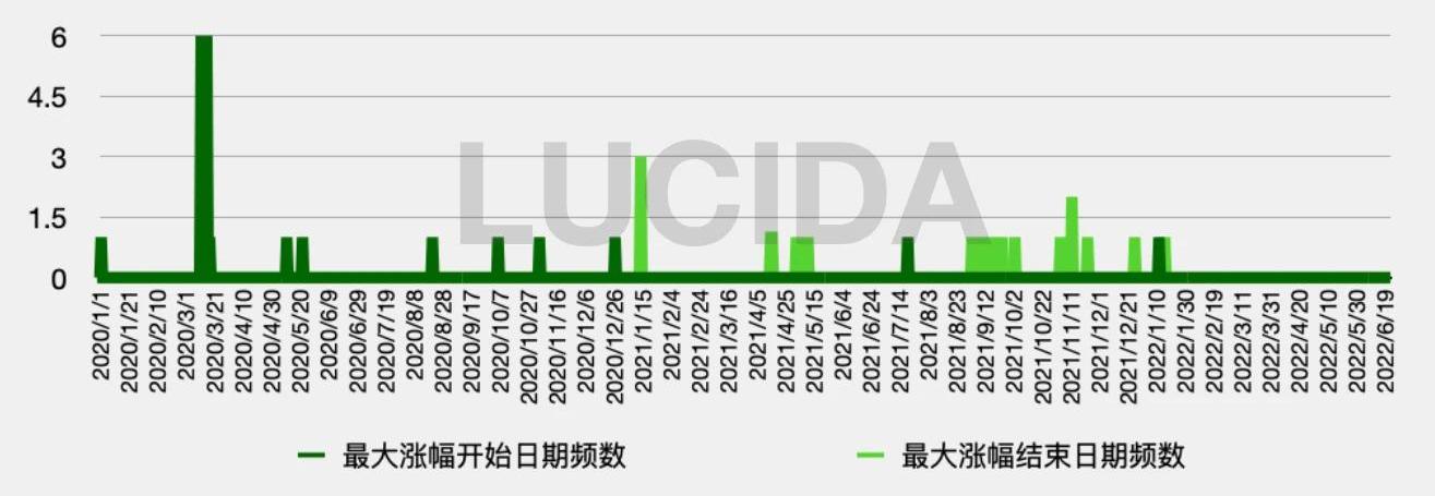 說完了收益分布,再來看看風險的部分。下面綠色的圖是21條公鏈最大漲幅的時間分布情況;絕大部分公鏈在2020年3月-8月開始上漲,并在2021年9月-12月陸續見頂,平均上漲周期為467天。