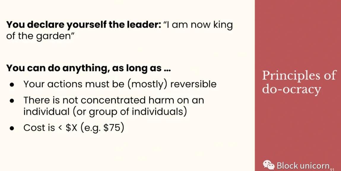 任何曾在組織中嘗試過分扁平化和達成共識的人都可能遇到過這些問題。這是60年代intentional生活公社的垮臺,以及1990年代更大規模的共產主義實驗。當每個人在任何事情上都始終擁有平等的發言權時,團隊可以說很多話,而最終一事無成。解決這一問題的一種方法來自于共同生活的社區,這些社區通常圍繞著一種叫做“do-ocracy”的原則組織起來。這一原則指出,一般來說,誰真正做了一件事,誰就制定規則。Cabin市議會成員之一、幾個成功的共同居住社區的創始人菲爾·萊文(PhilLevin)做了一場精彩的演講,名為“DAO可以從共同居住社區中學到什么”。菲爾的社區在自封的教條主義領導原則下開始蓬勃發展: