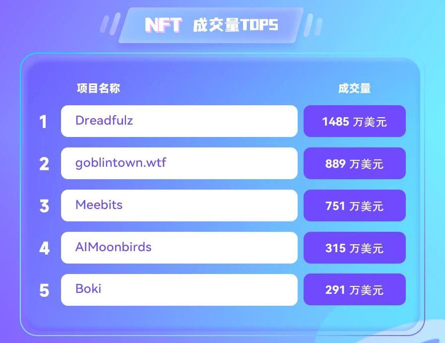 按過去24小時成交量,排名前五的項目分別為Dreadfulz、goblintown.wtf、Meebits、AIMoonbirds和Boki。