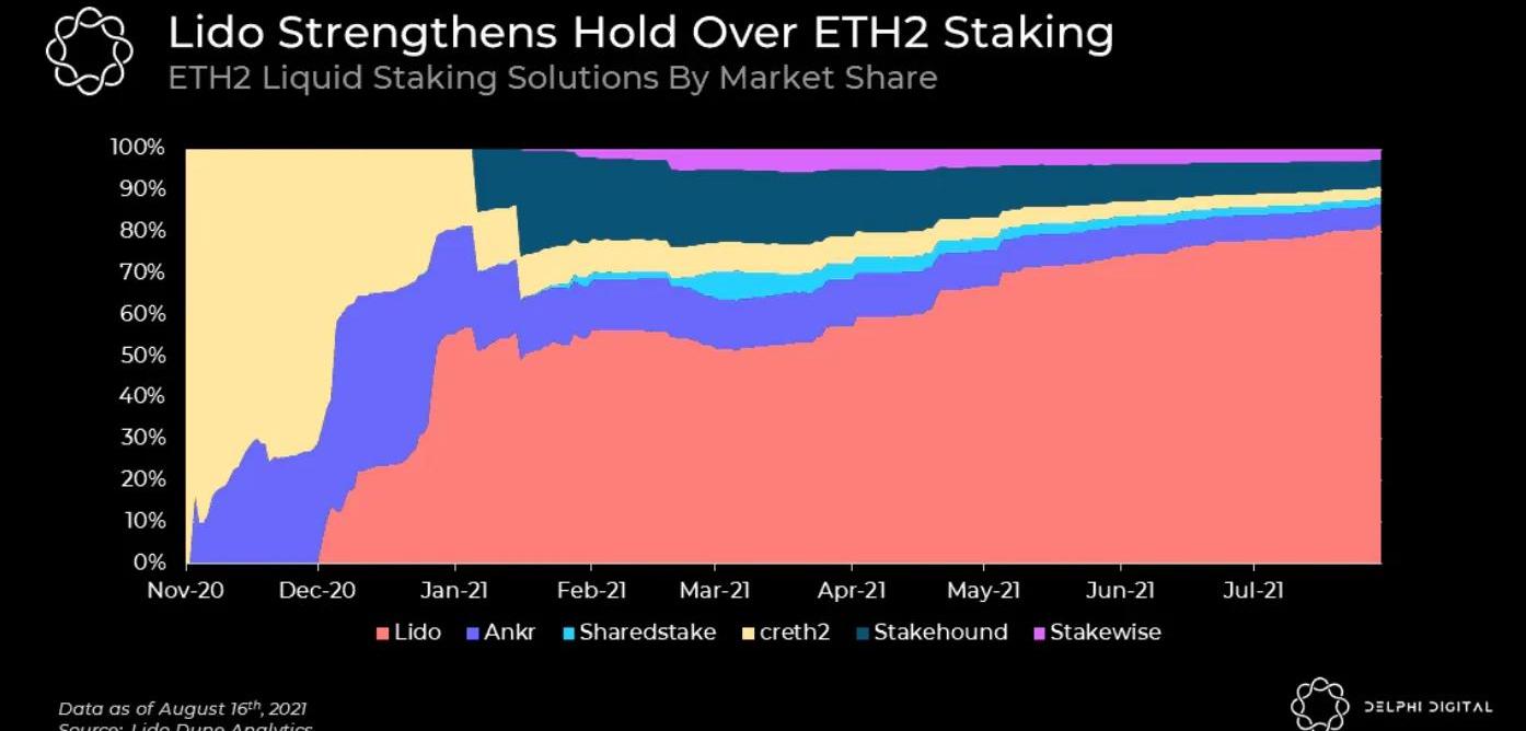 資料來源:DexScreenerstETH就像一個債券。1個stETH可以在不可預知的未來贖回1個ETH。我們不確定以太坊何時會在質押節點發布已質押資產,因為發布已質押資產需要在ETH2.0合并后進行硬分叉來更新。接下來的幾個圖表顯示,Lido主導了ETH的質押市場,并確保了很大一部分市場份額。