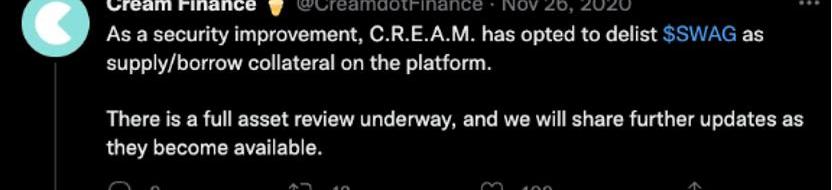 SwagFinance是由Machi創立的成人娛樂網站。并于2020年10月初推出其治理代幣。當Swag被悄無聲息地列為CreamFinance的抵押品時,上市缺乏透明度這一話題在Twitter上引發了極大的爭議,該代幣在幾周之內經歷了「從培養到拋棄」的全過程,最終從Cream中退出。