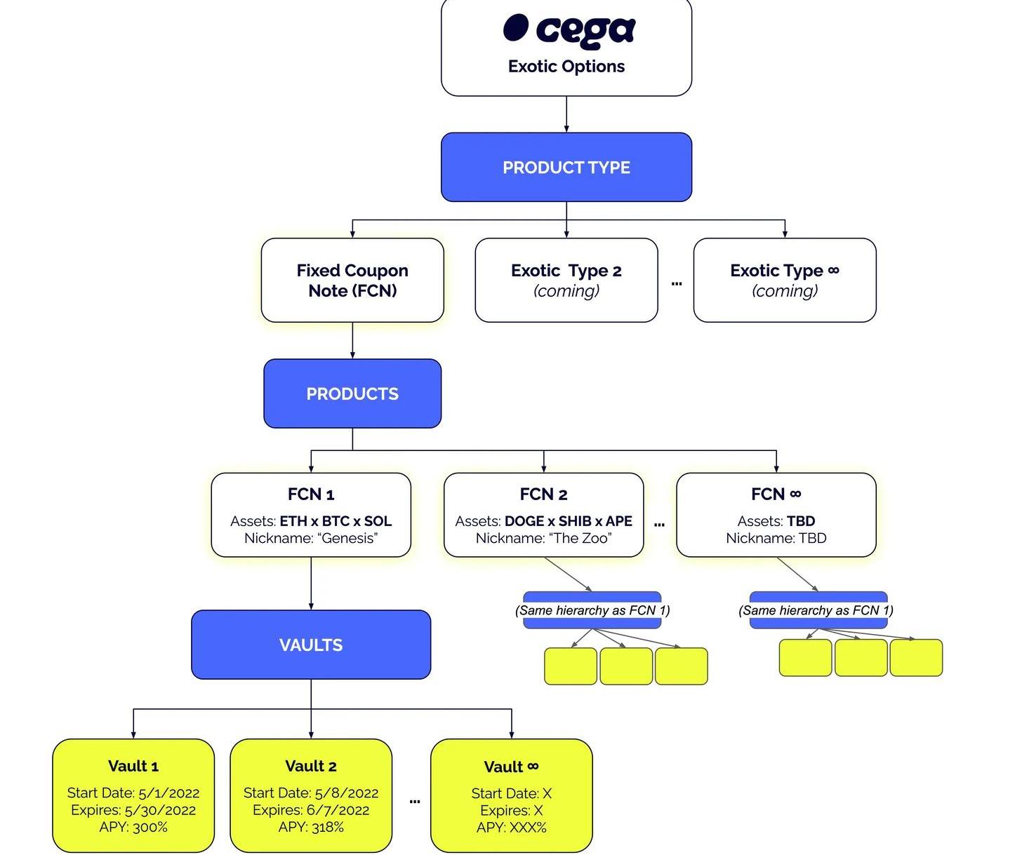 GMX在這方面并不孤單,因為永續交易的交易量一直做得很好,這里就不提取所有數據了。鏈上業務并沒有像往常一樣進行,但這些永續交易平臺各自的代幣一直保持良好,盡管大多數其他競爭幣周圍都存在混亂。像dYdX這樣的項目具有非常糟糕的代幣經濟學和良好的使用情況,這意味著不購買代幣可能會變得很愚蠢,因為它很可能會被更大的玩家作為“價值”游戲收購。我們有DeFi藍籌股,為什么沒有永久藍籌股?像Drift、PerpetualProtocol和01Exchange這樣的協議都非常有趣,并且引起了極大的興趣,他們需要保持自己的交易量,讓用戶滿意并確保他們不會破產。看看其他衍生協議,有一些在我們的視野之下,比如Cega、Vega和Zeta。許多相對較新的鏈上衍生平臺的使用量無法與我提到的一些大品牌相提并論,但它們為愿意嘗試未知領域的用戶提供了一些非常酷、有價值和獨特的產品。舉個例子,看看這張來自CegaFinance文檔的圖片: