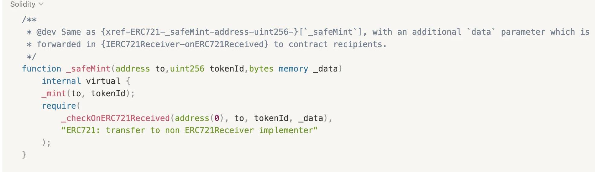 中間有_beforeTokenTransfer和_afterTokenTransfer屬于虛函數,作為標準,是讓項目方可以再不修改標準協議的情況下增加一些特定的邏輯代碼用的。2.2為何safeMint更安全