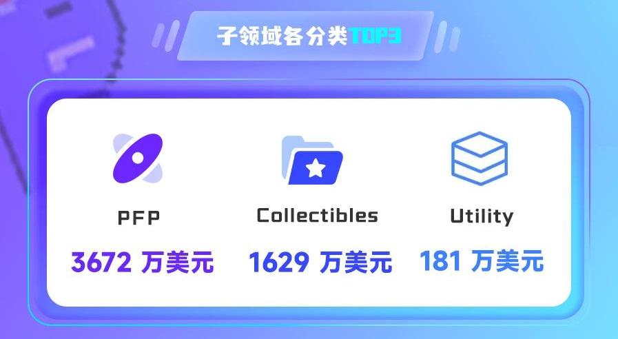 按過去24小時成交量,排前三的子領域分別為PFP、Collectibles和Utility。