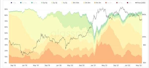 本周市場在周初跟隨了美股上周反彈的動能,比特幣在小幅反彈9%左右后隨即回歸3萬美元附近,截至撰稿時點比特幣收于29970,較上周上漲2.58%,結束了長達8周的連續下跌,以太坊相比則稍顯弱勢,一周下來原地踏步,僅上漲0.81%,收于1807.49。顯而易見的是,當前反彈動力不足,原地踏步往往意味著底部沒有探明,在加息縮表的大環境下,幣市不乏二次探底的可能性。新聞層面,本周加密市場依舊風平浪靜,值得注意的是幾個頭部NFT項目YugaLabs,以及Stepn紛紛收到黑客攻擊,其中YugaLabsDiscord受到服務器攻擊,200ETH的NFT被盜,Stepen受到多次DDOS攻擊,并進入短暫維護,當前損失不明,安全問題無論是在牛市還是熊市都是項目方首要需要考慮的問題。另外幣安趙長鵬仍表現出了對Terra事件的耿耿于懷,他在周五接受《財富》雜志采訪時首先表示了對Terra2.0的支持,同時也表示正在對Terra內部人士FatMan針對DoKwon和Terra指控的推文進行調查,FatMan聲稱Terra操縱市場,向交易所以及第三方付款使用戶造成數十億美元的損失,同時涉嫌內幕交易、代幣學經濟調整等欺詐手段。CZ表示正在調查此事,并將與執法機構合作幫助揭露騙局和欺詐行為。看回比特幣,從數據上看,囤幣黨隨著比特幣價格修正到3萬美元以下正在不斷持續地積累,其中賬戶余額小于100枚比特幣的實體,以及余額大于1萬枚比特幣的實體一直是重要的積累者。囤幣黨的一大重要特征即為對價格不敏感,他們選擇在低于心里價位的位置買入,并無條件持有,逐漸積累起了市場的底部,在經歷了5月的拋售之后,錢包再次“清洗”,不確定性的原因使得邊緣買家被沖出了市場。如圖所示,幣齡小于三個月的地址數量在縮小,這意味著比特幣供應正在向更高年齡段的地址遷移,其中1-2年、以及3-5年的地址市值增量最多。而從地址的歷史動作來看,他們更愿意一直持有倒下一個牛市周期。
