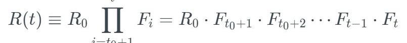 假設一個Vault在時間t_0創建時債務D_0被立即提取;標準化債務A計算為D_0/R_0某個Valut保險柜在某個時間t的總債務累計值則被計算為時間t_1到t_T的F_t與創建時起始債務D_0的連乘: