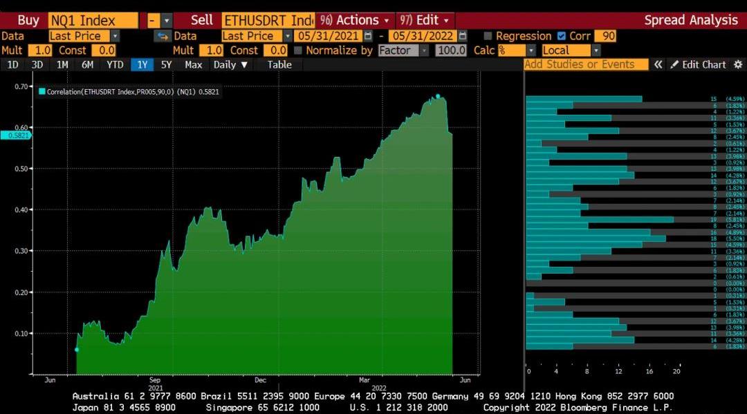鑒于加密貨幣是全球最后一個自由市場,并將更快地納入恢復風險的行列,我們有理由認為最近TerraUSD和LUNA的瀑布能砸出市場的底部。我想把兩個理論聯系起來。1.從收費調整后的業績來看,大多數科技風險投資公司都是對整體市場而言昂貴的貝塔系數的工具。因此,由于通貨膨脹壓垮了像Netflix這樣的風向標,因為用戶選擇吃而不是為觀看更多平庸的Netflix原創作品的特權付費,而世界上最成功的一些科技公司,如Facebook的用戶增長持平甚至為負,一般融資和IPO環境在2022年第一季度迅速惡化。再加上不斷上升的名義利率,你可以想象硅谷、北京中關村和梅菲爾的那些身穿巴塔哥尼亞、戴著卡其的兄弟們的痛苦。2.下面的理論來自于我認識的最聰明的加密貨幣交易員之一,我沒有做工作來驗證他的理論,但從邏輯上講,這是有道理的。他推測,刺破TerraUSD泡沫的事件源于VC的場外交易,他們需要以最小的市場影響來兌現其LUNA頭寸。由于區塊鏈的公開性,早期VC如果賣出大量的LUNA頭寸將很容易被發現。該協議允許LUNA的持有者以1美元的LUNA換取1個UST,以當前LUNA/UST的市場價格。該LUNA將被燒毀,并創造等量的UST,對更廣泛的LUNA價值沒有任何市場影響。利用場外交易,風險投資公司將大量的UST換成了其他的穩定幣,如USDT,USDC,甚至是美元法幣,這樣不會影響到市場。最終的結果是UST的供應量大幅增加,這最終影響了其價格的脫錨。這些流動性有將近50億美元。TerraUSD崩潰的開始是在掛鉤的曲線略微破裂時發生的。這是因為相對于USDT和USDC等其他穩定的貨幣,UST的供應量太大。一旦掛鉤開始輕微斷裂,并且對快速恢復的信心減弱,算法穩定幣設計的負凸性就會接管并產生不可阻擋的下降力量。把這兩個事件放在一起,通貨膨脹驅動的風險投資資產負債表收縮和Luna泡沫破裂,我的理論是,更廣泛的風險厭惡環境促使他們在同一時間兌現他們成功的LUNA投資。全球風險厭惡運動是美聯儲制造的。因此,TerraUSD的崩潰是全球央行收緊流動性的一個間接結果。因此,我相信這一事件帶來了痛苦,而這些痛苦無論如何都會在幾個月后隨著美聯儲和其他國家繼續收緊流動性條件而發生。鄭重聲明,我并不是要把TerraUSD的崩潰歸咎于美聯儲。它的崩潰是注定的,任何閱讀過白皮書或研究過算法穩定幣的人都可以理解。我的觀點是,美聯儲為最終會發生的事情提供了催化劑。值得慶幸的是,由于加密貨幣沒有政府救助,我們很快就找到了真正的清算價格,現在可以痊愈,然后繼續向我們的目標前進。我堅信,加密貨幣引領更廣泛的市場。數據支持這一點,因為在最近的加密貨幣市場崩潰期間,比特幣/以太幣和納斯達克100指數之間的相關性破裂。下面,讓我們重新審視一下相關性圖表,看看它們都是如何急劇轉低的。按照先后順序,以下是比特幣與前月納斯達克100指數期貨合約之間的10天、30天和90天滾動相關性圖表。