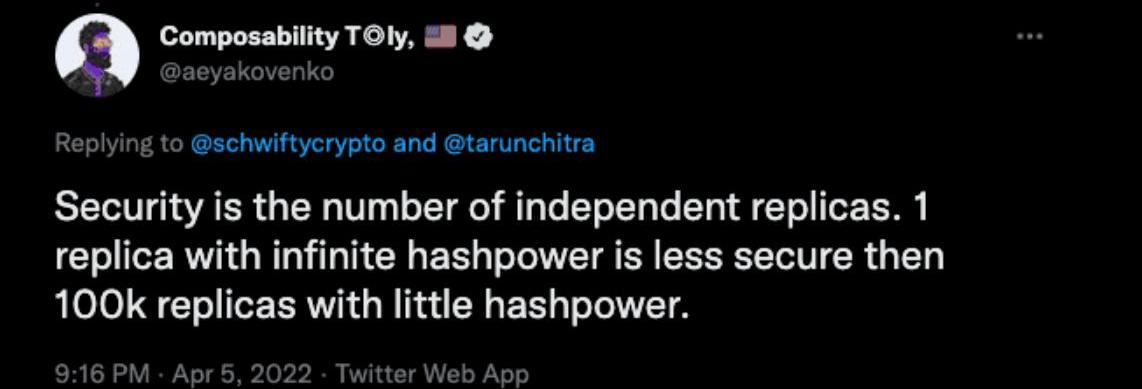這里的爭論可能歸結為:即使網絡市值較低,攻擊它也很難使個人獲利。似乎不太可能有人會試圖花費數百億美元來攻擊區塊鏈,以期快速賺錢并僥幸逃脫。更有可能是國家行為者采取行動來制裁一個全球重要的網絡,用相對而言較低的經濟成本造成的重大損害。在這一點上,它可能會歸結為與社區完全不同的觀點: