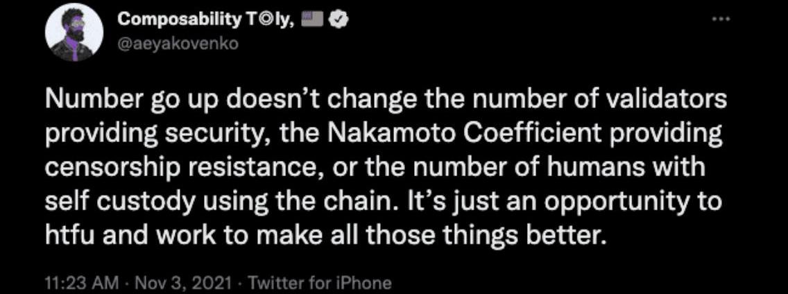中本聰系數可能是一萬億,但如果他們的累計質押是1美元,這將毫無意義。這是一個極端的例子,單獨看驗證者的數量意義不大,特別是假設一個大型的攻擊者將自己偽裝在許多實體后面,這在邏輯上是可行的。一個高的中本聰系數有助于防御攻擊者破壞許多分布式節點,但它對防止經濟攻擊毫無作用。在這方面,Solana最大限度地提高中本聰系數,同時也需要關注代幣價值捕獲。這尤其令人擔憂,因為Solana沒有能力應對這種攻擊。任何人都可以完全驗證Solana,但這需要99%的用戶永遠無法做到的大量資金和努力。以太坊或Celestia等網絡允許日常用戶享有全節點安全性,更有能力處理51%攻擊并從中恢復。加密保證總是優于加密經濟保證。如果所有的輕客戶端都知道不接受被攻擊的無效鏈,就可以大大減輕可能造成的損害。Anatoly經常說,Solana被優化是為了「阻止核戰爭中的第一次打擊」,而以太坊被優化是用于「收拾殘局」。一個常人難以企及的質押價值與防止罷工的中本系數一樣重要。