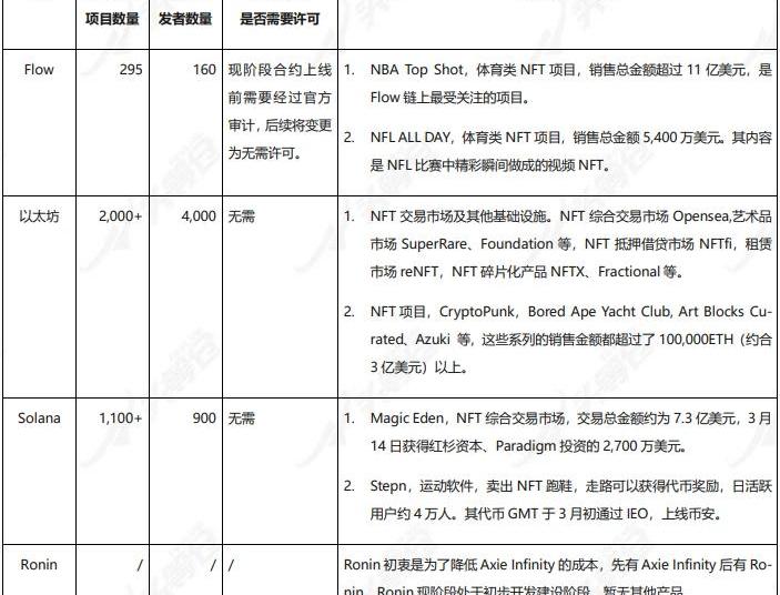 生態建設《2021ElectricCapitalDeveloperReport》對公鏈日活躍開發者數量的不同等級進行了劃分,以分析公鏈開發活動的活躍程度。第一梯隊為開發人員大于2,000人,只有以太坊在該等級上。第二梯隊為1,000至2,000人,為Polkadot。第三梯隊為300至1,000人,一共三家,分別為比特幣、Cosmos和Solana。第四梯隊為100至300人,Flow屬于該梯隊,該區域內還有Avalanche、Terra、Celo等公鏈。可見,Flow的開發者活躍程度較高。此外,Flow的開發者人數,也在穩定且持續的增長。相比2020年12月,2021年12月Flow的開發者增長了191%,大約翻了一倍。21因此,Flow屬于開發者較為活躍、開發者增速較快的公鏈。開發者越活躍,能夠提供的項目越多,生態就越豐富。相關生態的建設情況如下表所示:表5-5公鏈NFT生態建設情況