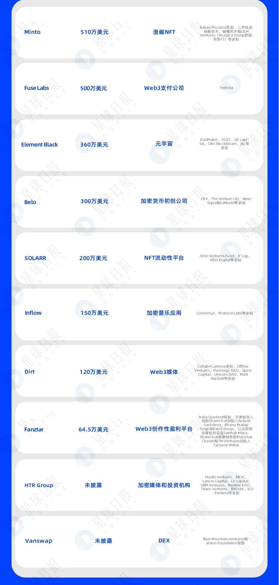 Chainalysis以86億美元估值完成1.7億美元融資,GIC領投消息人士透露,區塊鏈數據分析公司Chainalysis以86億美元的估值完成1.7億美元F輪融資,新加坡主權財富基金GIC領投。Crunchbase數據顯示,Chainalysis總融資額為5.36億美元,其他投資方包括Dragoneer、DurableCapitalPartners、9YardsCapital、AltimeterCapitalManagement、Blackstone、SequoiaHeritage和SVBCapital。據悉,Chainalysis于2021年6月以42億美元估值完成1億美元E輪融資,Coatue領投;2021年3月以超20億美元的估值完成1億美元D輪融資,Paradigm領投。Web3初創公司Naetion從GEMDigital獲得1.5億美元投資星球日報訊Naetion是一家總部位于丹麥的web3初創公司,致力于打造世界上最大的鏈上職業網絡,今天宣布已從數字資產投資公司GEMDigitalLimited獲得總額為1.5億美元的投資。KuCoin以100億美元估值完成1.5億美元融資,JumpCrypto領投星球日報訊加密貨幣交易所KuCoin周二宣布以100億美元估值完成1.5億美元融資,JumpTrading的投資部門JumpCrypto領投,CircleVentures、IDGCapital和MatrixPartners參投。籌集資金將用于擴展交易服務,并發展Web3業務。此外,KuCoin表示,將提升其在加密貨幣錢包、P2E游戲、DeFi和NFT平臺的投資組合。籌集資金還將用于加強KuCoin基于以太坊的公鏈。*Opn完成約1.2億美元C+輪融資,三菱UFJ銀行等參投區塊鏈支付公司Omise母公司Opn宣布完成約1.2億美元C+輪融資,三菱UFJ銀行、MarsGrowth、JICVentureGrowthInvestments參投。目前Opn總融資額已超2.22億美元。據悉,Opn成立于2013年,專注于在線支付、金融科技應用的區塊鏈技術和數字化轉型解決方案。旗下有NFT發行和銷售平臺OpnMint和支付基礎設施OpnPayments。此外,其支付服務以Omise的名義運營,包括基于以太坊的第二層區塊鏈產品OMGNetwork。OMGNetwork于2020年12月被GenesisBlockVentures收購。數字資產機構交易平臺Talos以12.5億美元估值完成1.05億美元B輪融資,GeneralAtlantic領投數字資產機構交易平臺Talos以12.5億美元估值完成1.05億美元B輪融資,GeneralAtlantic領投,花旗集團、紐約梅隆銀行、富國銀行、a16z、PayPalVentures和FidelityInvestments參投。Talos為機構投資者提供最優的交易解決方案,其產品幫助客戶一站式查看交易平臺和做市商的價格,并為交易的所有階段發布指令——甚至是復雜的算法階段。ElwoodTechnologies完成7000萬美元A輪融資,高盛與DawnCapital領投知名對沖基金經理AlanHoward旗下加密技術公司ElwoodTechnologies宣布完成7000萬美元A輪融資,GoldmanSachs和DawnCapital領投,Barclays、BlockFiVentures、ChimeraVentures、CommerzVentures、DigitalCurrencyGroup、FlowTraders和GalaxyDigitalVentures參投。籌集資金將用于產品擴展以及全球化發展。加密市場監測公司SolidusLabs完成4500萬美元B輪融資,LibertyCityVentures領投加密市場監測公司SolidusLabs完成4500萬美元B輪融資,LibertyCityVentures領投,EvolutionEquityPartners、DeclarationPartners、前美國貨幣監理署BrianBrooks和前CFTC主席ChristopherGiancarlo等參投。據悉,SolidusLabs提供了一套針對50多種不同類型的安全威脅解析區塊鏈數據的工具,例如清洗交易、欺騙交易以及拉高和拋售計劃。P2E游戲MechaFightClub完成4000萬美元A輪融資,a16z領投,SolanaVentures等參投星球日報訊官方消息,P2E游戲MechaFightClub宣布完成4000萬美元A輪融資,a16z領投,MichaelOvitz、SonamKAhuja、LuBall13.eth、SolanaVentures等參投。此前消息,據美國SEC周五的文件顯示,鏈游公司IrreverentLabs最近完成4000萬美元融資,共有11名投資者參與此次股權和期權融資,將推出P2E游戲MechaFightClub。Web3開發平臺Moralis完成4000萬美元A輪融資,CoinbaseVentures等參投Web3開發平臺Moralis宣布完成4000萬美元A輪融資,EQTVentures、FabricVentures、CoinbaseVentures和DispersionCapital等參投。Moralis為開發人員提供基礎設施以構建和發布跨鏈應用程序、游戲和NFT。此輪融資將用于產品開發、改善用戶體驗,以增加其客戶容量和支持更大的客戶。加密創企BVNK以3.4億美元估值完成4000萬美元A輪融資,TigerGlobal領投加密貨幣初創公司BVNK已完成4000萬美元A輪融資,投后估值為3.4億美元,TigerGlobal領投,TheRabaPartnership、Avenir、KingswayCapital、Nordstar、Concentric、BaseCapital等參投。新資金將用于擴展加密銀行服務。BVNK為加密原生企業提供銀行服務和支付。使用BVNK的公司可以接受法定貨幣和加密貨幣的付款,持有數百種不同的貨幣和加密資產,并將資金發送到世界各地。*Token.io完成4000萬美元融資,CotaCapital和TempoCap領投星球日報訊英國初創公司Token.io完成4000萬美元融資,CotaCapital和TempoCap領投,ElementVentures、MissionOG、PostFinance、OctopusVentures、OperaTechVentures、SBIInvestments等參投。*可再生能源數據中心開發商Soluna完成3500萬美元融資可再生能源數據中心開發商SolunaHoldings從私募股權公司SpringLaneCapital獲得3500萬美元項目投資,本輪融資將用于建設更多數據中心相關設施,抱愧三個節能設施并將轉化的能源用于比特幣挖礦以及AI計算。非洲加密初創公司Jambo完成3000萬美元A輪融資,Paradigm領投星球日報訊非洲加密初創公司Jambo完成3000萬美元A輪融資,Paradigm領投,PanteraCapital、DelphiVentures、KingswayCapital和GeminiFrontierFund參投。籌集資金將用于開發產品、擴大團隊。OasisPro完成超2700萬美元A輪融資,UDHC等參投星球日報訊金融科技和區塊鏈公司OasisProInc.完成超2700萬美元A輪融資,UDHC、BlizzardtheAvalancheFund、Inveniam、RedwoodTrust(NYSE:RWT)、TrustLabs、MiraeAssetVentureInvestment、GateVentures、LedgerPrime、StableNode等參投。融資將用于通