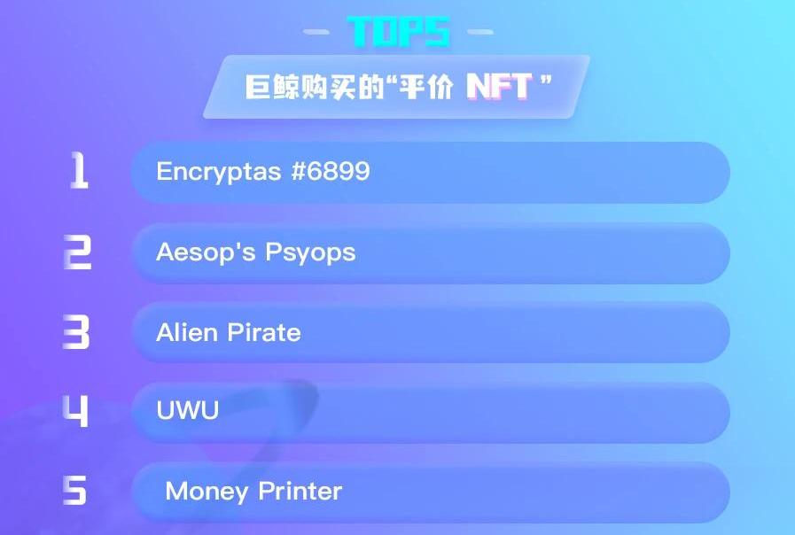 過去24小時,巨鯨購買的“平價NFT”中排前五的分別是:Encryptas#6899、Aesop'sPsyops、AlienPirate、UWU和MoneyPrinter。