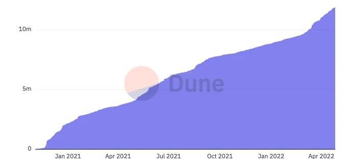 持有NFT的錢包累計總數-來源:DuneAnalytics持有NFT的獨立錢包數量從981,315增加到398萬,增長了306%。這衡量了在某個時間點上持有ERC-721代幣的錢包地址數量,該代幣標準用于發行NFT。