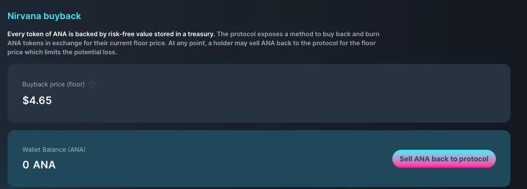 這部分將介紹Nirvana協議上最后一個功能「Nirvanabuyback」。當ANA代幣價格大幅下跌,跌破底價時,用戶可以點擊該功能,以當前底價將所有ANA賣回給協議,不會產生任何滑點。