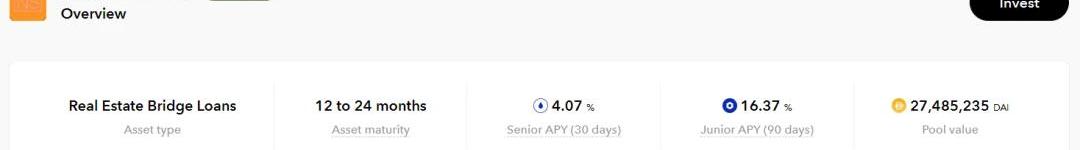 在Asset發起人板塊,您可以了解到Asset池中的Asset類型。例如,NewSilver是房地產過橋LoanAssets池。這意味著您作為投資者,將為NewSilver活躍的房地產過橋LoanAssets進行Financing。PoolOverview將幫助您選擇Asset池子,用戶可以在其中找到對Asset發起人和Asset類型的簡短介紹。在標題中,您會看到這個Asset池子最重要的幾個指標:Asset類型、Asset償還期限、DROPAPR和Asset池子價值。同時每個Asset池子由兩個部分組成,Tin通證和Drop通證,用戶可以通過兩種通證比例來調控自己投資組合的利潤以及風險。Tin通證意味著高風險高收益,其風險來自于通證贖回時偏后的次序,當開始通證贖回時,只有在完成Drop通證全部通證的贖回后才會開始Tin通證的贖回,而這也是Drop通證的低風險所在。與此同時Asset池子的創立者,即TinlakeBorrower會被強制要求購買一定比例的Tin通證以降低每個Asset池子的風險。