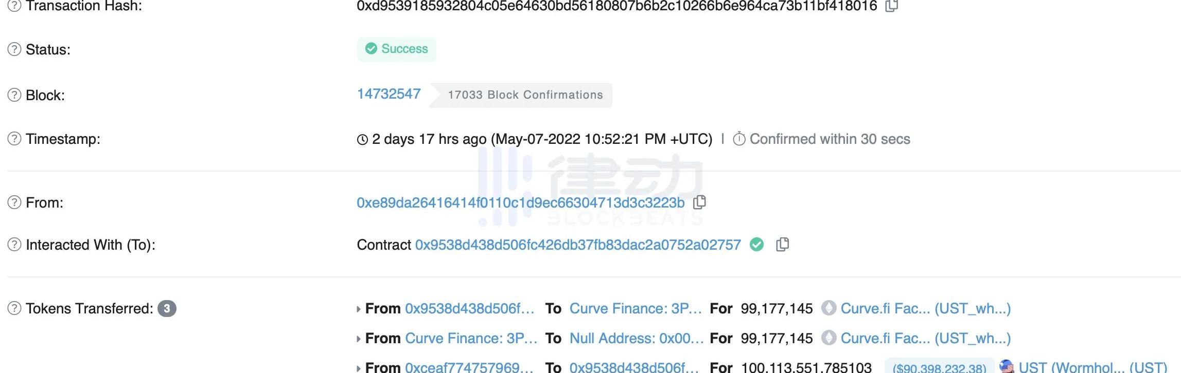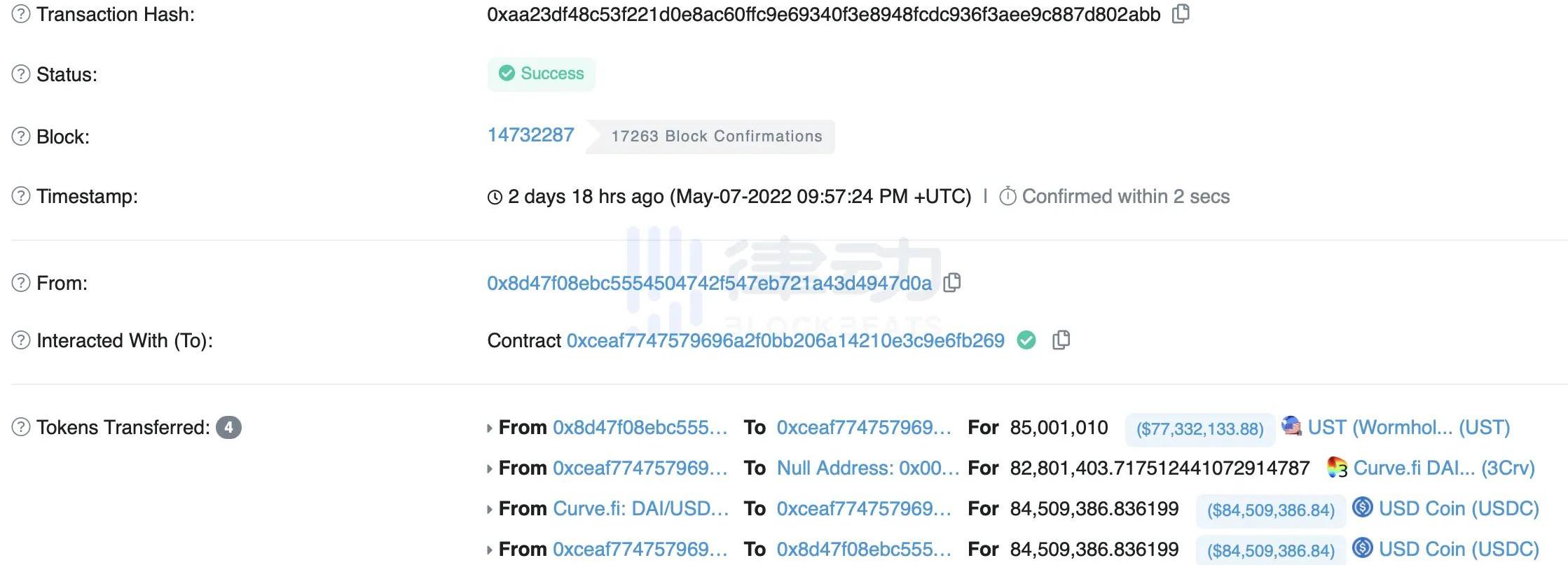 約10分鐘后,一個新地址突然將8400萬美元的UST拋售,嚴重影響了3crv池平衡。