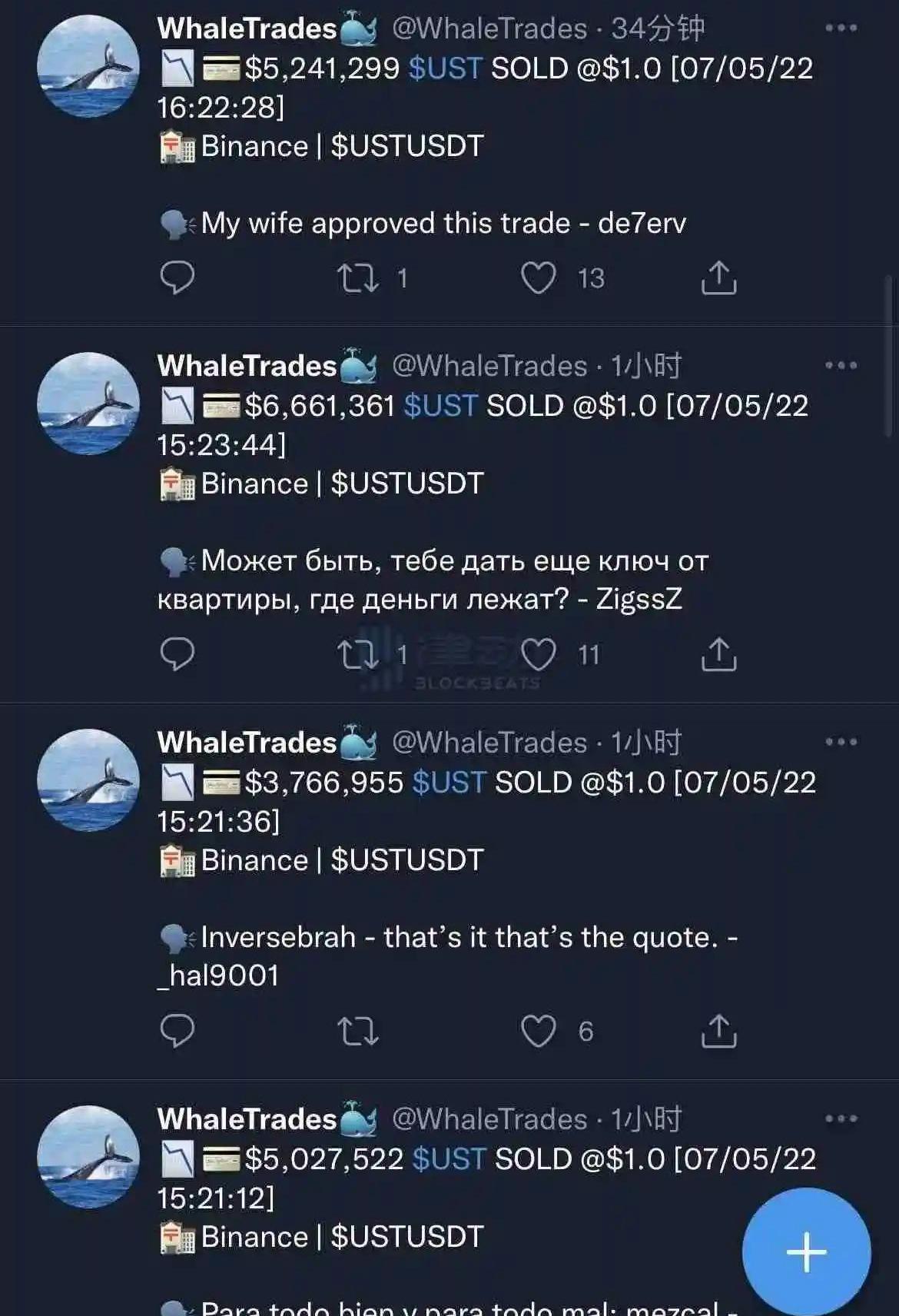 沒過多久,多個巨鯨帳戶開始不斷在Binance拋售UST,每筆交易金額都是百萬美元級別。