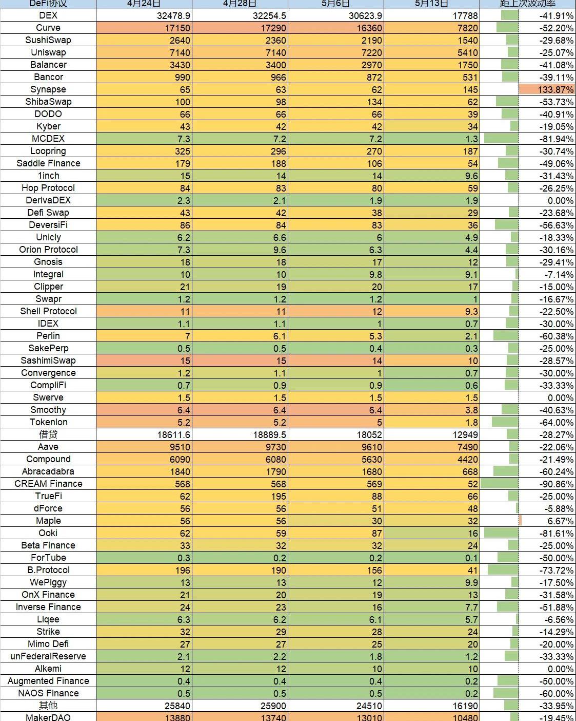 本周Terra鏈基本消失,ETH鏈重新將TVL占比提高至64.26%,單周占比增長9.2%,基本恢復至21年十月份水平;除此之外受益最大的為BSC和Tron,占比分別提高1.55%和1.17%。Terra的消亡可能會出現一些新的挑戰者,短期內小公鏈均值得關注。各鏈協議鎖倉量情況