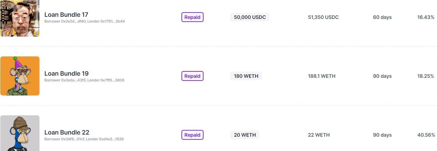 NFT20上的NFT碎片化案例為了解決NFT碎片丟失或者無法買回帶來的NFT無法重組問題,Fractional還提出了買斷拍賣模式。三,通過質押NFT獲得貸款。代表項目有Arcade、StripFinance。以Arcade上的LoanBundle19為例。用戶A抵押BAYC#4743,發布了180WETH的貸款需求,并提供18.25%的APR,貸款時長90天。假設用戶B對這個報價滿意,并為用戶A提供了貸款。那么90天到期后,如果A能如期歸還180WETH的本金并支付8.1WETH的利息,就能拿回BAYC#4743。否則,BAYC#4743將被劃入用戶B的名下。