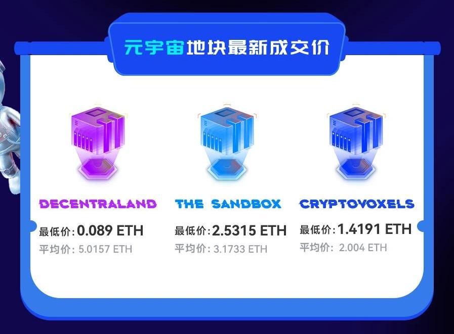 元宇宙平臺中,過去24小時內,Decentraland上的地塊最低成交價為0.089ETH、平均成交價為5.0157ETH;TheSandbox上的地塊最低成交價為2.5315ETH、平均成交價為3.1733ETH;Cryptovoxels上的地塊最低成交價為1.4191ETH、平均成交價為2.004ETH。