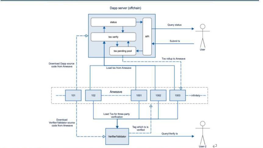 Arweave通過去中心化的運行方式以及POA共識機制為用戶提供數據存儲服務,同時向提供存儲服務的礦工給予AR獎勵。POA實現的基礎為Arweave獨創的Blockweaves結構,每一區塊不僅與先前塊相連,還同時與一個召回塊相連,召回塊的生成則取決于先前塊的哈希值以及區塊高度。在決定出塊礦工時,礦工必須證明他們能夠訪問召回塊中的數據,從而獲得出塊權,進而獲得出塊獎勵。因此這就要求礦工1)盡可能多的復制各類區塊;2)盡可能的保存難以復制的區塊:3)盡可能的保存存儲人數較少的區塊,從而在開采新塊時獲得更多的優勢。同時由于區塊鏈特有的數據可驗證和可追溯的特性,能夠極大程度的確保鏈上數據的可信性,從而實現可信的永久存儲。Arweave采用"一次付費,永久存儲"的模式。長期來看AR的存儲的成本非常低,甚至接近于零。且AR的存儲效率較快,因此,AR常被比喻為圖靈機的磁帶,就像磁帶一樣、以較低的成本存儲用戶數據。因此,利用AR的高效、低成本的存儲,可以將數據計算放在鏈下進行,而數據源來自于AR鏈上、且計算結果也會存證上鏈。SCP(基于存儲的共識范式,Storage-basedConsensusParadigm)正是實現基于AR的計算,即AR作為數據來源的圖靈磁帶,為鏈下應用程序提供數據源,計算結果亦上傳到AR存證。其效率決定于鏈下應用程序和計算機的性能,自然比基于共識機制的鏈上計算要高。在以太坊等傳統Layer1上,計算、存儲以及共識等功能均由節點負責,通過POW等共識機制完成上鏈存證,而受不可能三角的束縛,其效率可想而知。而SCP則將鏈上存證與計算功能相分離。簡而言之,公鏈本身更像是計算機硬盤,只負責數據的存儲。在保證鏈上存儲數據可信的前提下,智能合約的執行則可以在鏈下任何具有計算能力的設備上進行。SCP的理念源于SmartWeave,其為建立在Arweave上的智能合約平臺,通過懶惰評估過程將智能合約的執行負擔轉移到用戶身上。不同于以太坊每個節點都要執行每一筆交易,SmartWeave采用“惰性評估”系統,將交易驗證的計算交給用戶。當用戶與SmartWeave合約交互時,他們會評估dApp上的每筆先前交易,確認與鏈上存儲數據最新狀態一致,然后將交易結果寫入Arweave網絡進行存證,如此重復。運行時,可將SmartWeave看作是鏈外運行的虛擬機。其通過讀取應用程序的代碼以及Arweave上的輸入參數,在本地完成交易的執行,之后再將輸出結果與Arweave同步,從而實現鏈上存儲與鏈下計算的分離。用戶的驗證工作類似區塊的鏈式結構,逐級追溯、驗證交易,而這一切并不需要在鏈上完成,而是用戶在鏈下完成的工作,也就是說,這個環節可以不受共識機制的束縛。