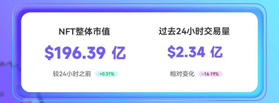 截至4月6日15時,NFT整體市值196.39億美元,較24小時前增長0.31%;過去24小時內總交易量約2.34億美元,日環比下降16.19%。