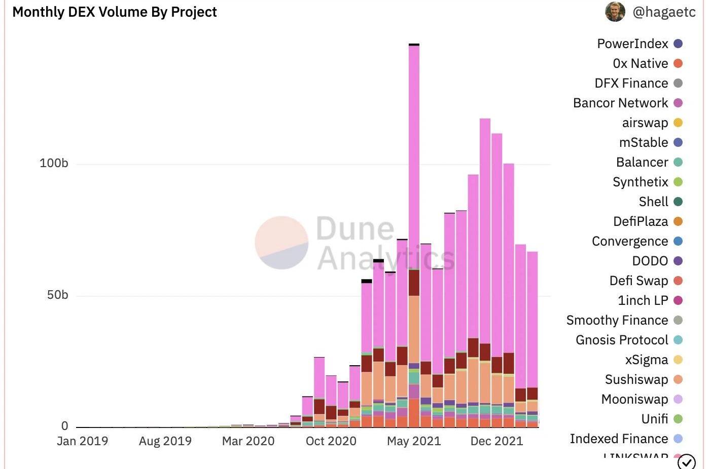 USDT、USDC、BUSD、UST、DAI這五種穩定幣都已進入加密貨幣市值的前20。MIM是市值前八的穩定幣中唯一一個出現下降的,因為0xsifu的身份被曝光,MIM一度出現2%以上的負溢價,導致恐慌。而UST是其中增長最快的穩定幣,市值在這一個季度增長61.9%。Terra和Frax聯合推出Curve4pool的消息可能改變去中心化穩定幣的格局。與原來常用的3pool相比,4pool用UST和FRAX代替DAI,和USDT、USDC組成包含四種穩定幣的流動性池,再為其它穩定幣提供流動性,并發放激勵。由于現在Curve3pool最大的客戶就是Frax,且Frax和Terra已經積累了大量的CVX,控制了較大權重的CRV分發,MakerDAO發行的DAI在競爭中可能陷入被動的局面。市場也期待著DAI能有怎樣的反擊舉動。去中心化交易所Uniswap“帝位”穩固