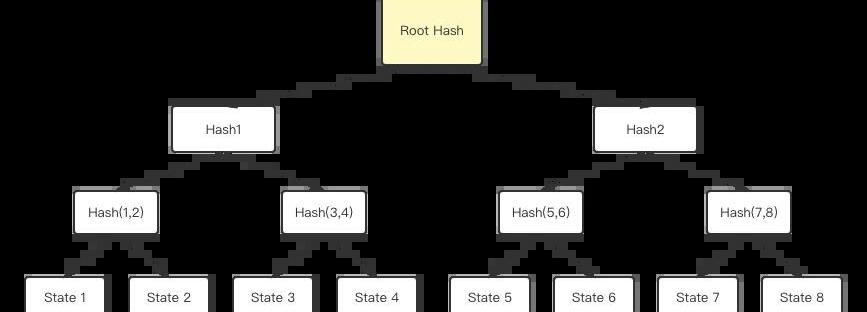 這個合約用來維護Rollup層中的狀態記錄,這個狀態記錄實際上是一棵默克爾樹的根節點存儲的哈希值,這個哈希值被稱為stateroot。而這顆默克爾樹的葉子節點是Rollup中的賬戶狀態信息。如果你不知道什么是默克爾樹,以下是一個簡單的例子: