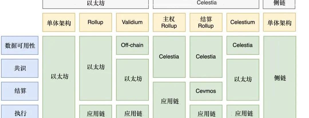 “Celo計劃將一個價值30億美元的L1區塊鏈重組為基于Celestia之上的主權rollup,隨著模塊化基礎設施的成熟,我預計會有更多的項目會選擇這樣做,因為他們會意識到數據可用性、共識、結算和執行不需要捆綁在一起。區塊鏈的拆分才剛剛開始。”而來自ConsenSys的L2區塊鏈工程師faina.eth則不認同RyanWatkins的說法,其評論稱:“但如果它們沒有捆綁在一起,那么‘rollup’就只是一個側鏈,不是嗎?這本身并沒有錯,但我們應該明確一下術語。”那么究竟哪種說法更值得認可呢?我們先通過一張圖來簡單了解以太坊、Celestia以及側鏈的架構有哪些不同。