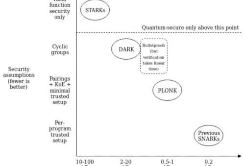 橫軸代表證明尺寸的大小,縱軸則代表安全性假設。其中,安全性最高的是STARK算法,該種算法不依賴數學難題假設,具有抗量子性;證明尺寸最小的是SNARK方案中的Groth16算法;PLONK也是SNARK方案中的一種,安全性和證明尺寸都處于適中。目前應用最廣泛的就是zk-STARK和zk-SNARK兩類。1.3.1zk-SNARKSNARK是簡潔非交互式知識論證的縮寫。該種方案的特性是簡潔的,即驗證過程不涉及大量數據傳輸以及驗證算法簡單,這就意味著驗證時間不會隨著運算吞吐量而成倍增長。其次,非交互式知識論證是從證明者到驗證者的單條信息,會讓整個驗證過程變得更加高效。而Groth16是目前驗證速度最快、數據量最小的zk-SNARK,Zcash是其首個廣泛實現。Groth16是在Pinocchio協議上做了進一步優化,在略微加強安全性假設的情況下,把證明尺寸壓縮了將近一半。但是Groth16方案的備受爭議的一點就是,因為CRS中隱藏的隨機值通常是有小部分群體制定的,因此可能存在信任問題。而且,理論上來說,如果證明者擁有足夠的算力,就可以提交假證明,從而影響整個系統的安全。這也是為什么量子計算機被認為可以威脅這種算法的原因。所以,也是其它零知識證明技術努力嘗試克服的最核心問題。PLONK算法也是針對可信設置做出的改進,我們會在后文詳細論述這兩種算法的差別。為了解決這個問題,斯坦福密碼學家BenediktBünz等人提出Bulletproof技術,相比較早的zk-SNARK,不需要初始化可信設置,但是計算和驗證時間都比STARK長,但是證明尺寸比STARK小得多,該種方案一經提出就被Monero項目采納。1.3.2zk-STARKSTARK是可擴展的透明知識論證,是作為SNARK的替代版本而創建的。與SNARK的Succinct的“S”不同,STARK的“S”代表的是Scalable,主要表現在STARK生成證明時間復雜度近似于計算的復雜度,而驗證證明的時間復雜度遠小于計算的復雜度。也就是說隨著STARK擴展性提高,STARK的證明復雜度并沒有相應增加。但更重要的是,STARK不需要進行初始化可信設置,因為它們依賴于通過哈希函數碰撞進行更精簡的對稱加密方式。這也是STARK中的部分。STARK相較于SANRK的第三個改進是抗量子計算,意味著其并不會被量子計算破解。當然,這些改進同時也伴隨著犧牲。相比于SNARK,STARK更加復雜,證明大小從288字節增加到幾百KB,而且消耗的以太坊驗證手續費也更高。
