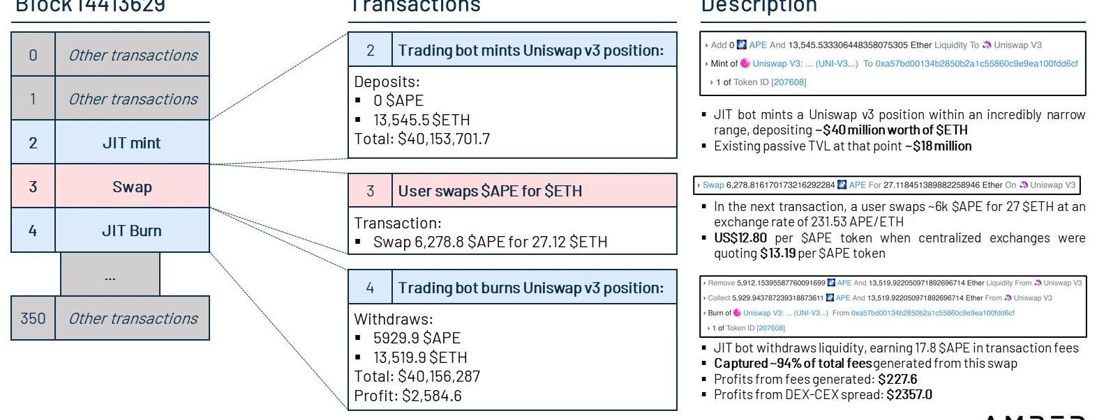 即時(JIT)流動性是Uniswapv3帶來的有害突發行為之一,但它的危害性仍然存在爭議。當交易者在內存池中看到尚未打包上鏈的交換交易時,機器人會在交換完成之前小心地在一個窄的驚人的范圍內增加集中流動性,在交換交易完成之后再消除流動性,這通常都包含在一個區塊中。通過這種三明治套利,機器人能夠在“三明治”交換交易中獲得高比例費用收益,同時幾乎沒有無常損失風險。在以下的最新例子中,我們來看一下JIT流動性的工作原理。當一個用戶希望交換價值約8萬美元的猿猴幣時,交易機器人鑄造了一個僅由$ETH組成的Uniswapv3頭寸,允許該用戶在接下來的交易中將$APE換成$ETH,然后移除該流動性。請注意,在此示例中,機器人不僅獲取了不尋常的高比例費用收益,還從Uniswap和FTX等中心化交易所的差價中獲利。快閃機器人示例