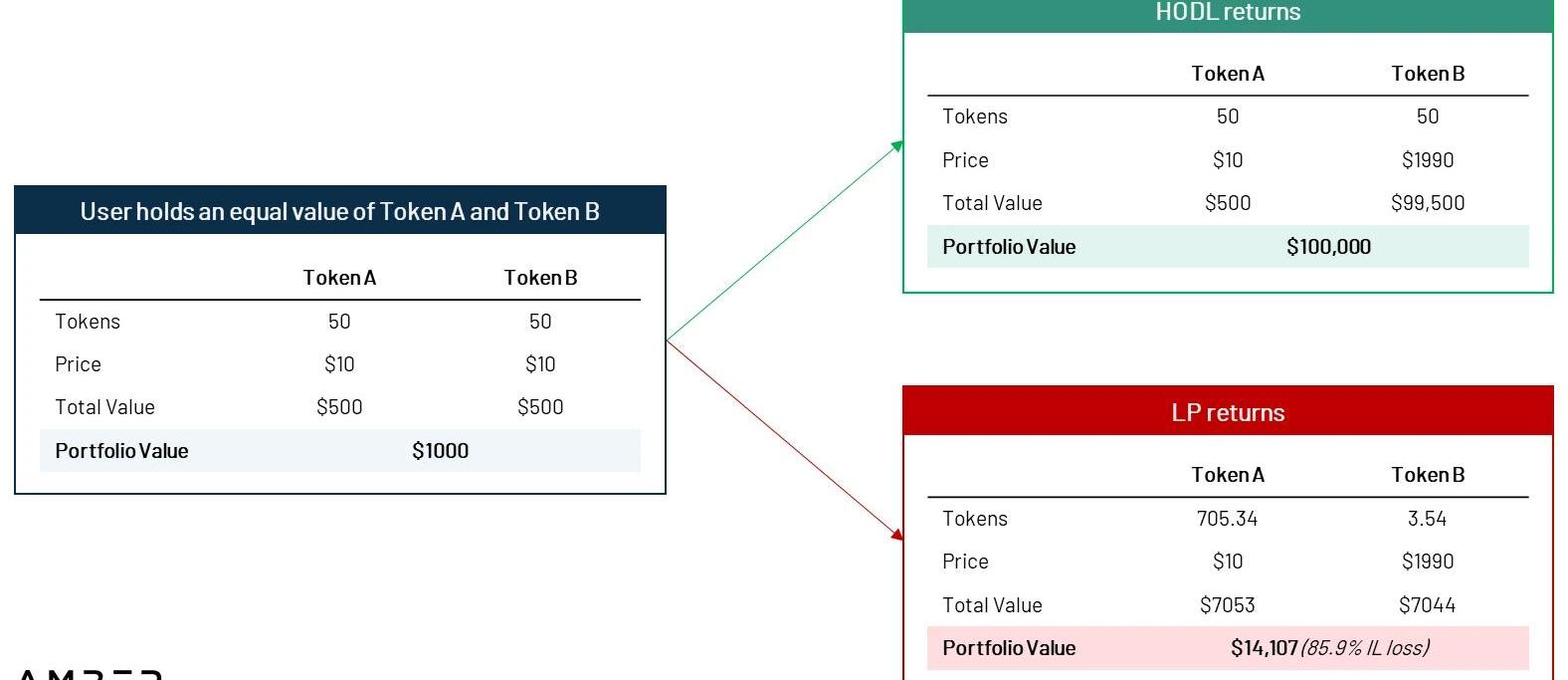 無常損失是指有時即便流動性提供者有費用收入,但其質押資產價值會縮水。更具體地說,通常我們可以定義無常損失為AMM中存入代幣與僅在錢包中持有代幣之間的價值差異。IL背后的道理很簡單:恒定乘積AMM始終在購買表現不佳的代幣,同時出售表現出色的代幣。因此,在AMM之外本可以升值1000倍的投資在AMM內僅能升值14倍。無常損失可能是永久的