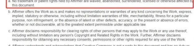 其次,CC0消極明確了,CC0是不涉及著作權?所擁有的商標權或專利權,上述權利不會因本聲明?被放棄、讓渡、授權或者受到其它影響。
