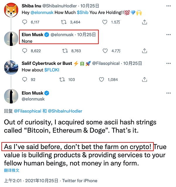 馬斯克因在上半年喊單DOGE而被網友推舉為「狗狗幣教父」。周日,有網友在推特上詢問馬斯克持有多少SHIB,結果「教父」回復「沒有」。之后,他干脆提示用戶,不要將他們的全部積蓄投資加密資產,「真正的價值在于為您的人類同胞打造產品和提供服務,而不是任何形式的金錢。」