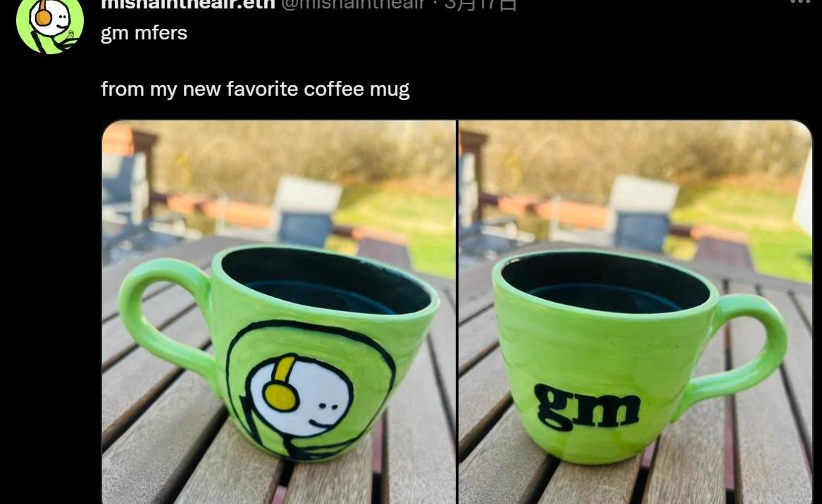 一切都是虛幻的,但人與人之間的關系是真實的。比如,不管是中文還是英文社群,都出現了“gm文化”。所謂gm,就是GoodMorning!每天早晨,劃水的mfers都會在群里跟大家打聲招呼。我猜,那時候他們的肉身可能在地鐵上迷糊地搖晃;可能在辦公桌前坐定,剛泡好一杯溫熱的咖啡。