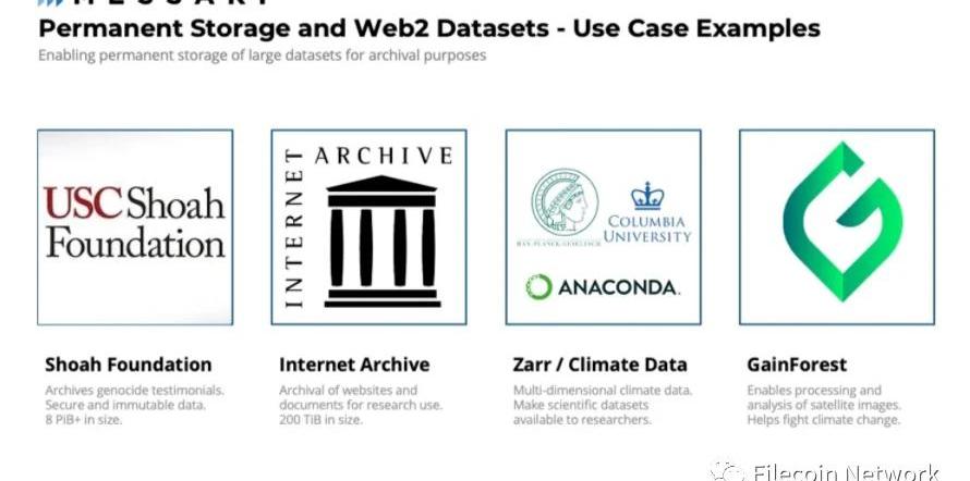 與Arweave類似,Lighthouse讓Filecoin用戶以固定價格永久存儲文件。此外,Filecoin虛擬機將會支持智能合約里實現的永續性存儲。永續性存儲的重要用之一是數據存檔。考慮到Filecoin的規模,這目標是讓存檔存儲的性價比盡量高,特別是降低Filecoin上搭建應用的開發者們的成本。這將創建和保存為人類服務的信息層。ShoahFoundation在存檔幸存者證言方面是一個重要的項目。當涉及到大型公共數據集時,就需要提到互聯網檔案館項目(https://archive.org/)使用Filecoin來存儲網站和文檔給公眾訪問。此外,Zarr和GainForest存儲了大型的公共數據集,目標是預防氣候變化帶來的自然災害。Zarr項目讓很大范圍內的研究人員都能獲得氣候數據來進行分析。而GainForest利用衛星照片來對抗氣候變化的影響。