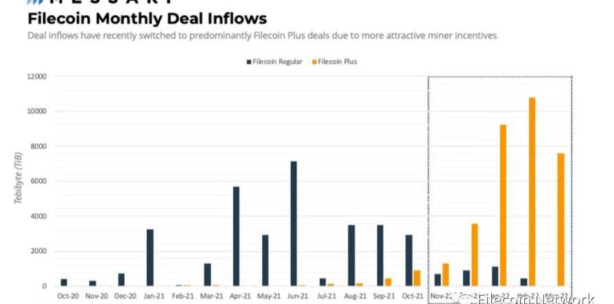對Filecoin的需求分別來自Web2和Web3的存儲使用場景。如果將存儲交易協議中綁定的存儲容量加起來,就可以量化對Filecoin的需求。不過,當分析存儲交易協議里的底層內容時,就很難區分有用的存儲和存儲提供者濫用網絡生成隨機內容之間的差別。為了增加Filecoin里有用數據的容量,FilecoinPlus激勵計劃應運而生。這個計劃激勵存儲提供者參與被驗證的交易協議——這是通過隨時間推移增加其區塊獎勵的份額來實現的。存儲交易協議的輸入數據從2020年10月的400TiB增加到2022年3月的7600TiB以上,而FilecoinPlus顯然對這個增長有貢獻。從2021年第四季度起,有一個趨勢,就是未驗證的數據轉換為由FilecoinPlus驗證過的存儲協議主導的數據輸入。