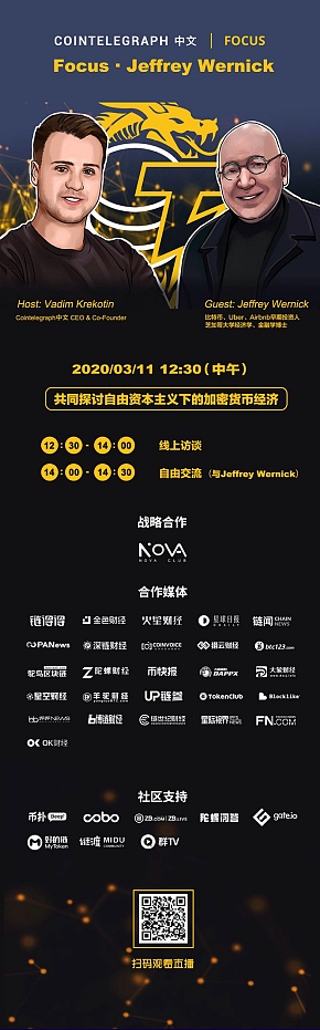 3月11日Cointelegraph中文線上脫口秀系列欄目Focus首秀圓滿結束。本次分享主持人由Cointelegraph中文CEO&Co-Founder Vadim Krekotin擔任,嘉賓是Jeffrey Wernick,比特幣、Uber、Airbnb早期投資人,芝加哥大學經濟學、金融學碩士。