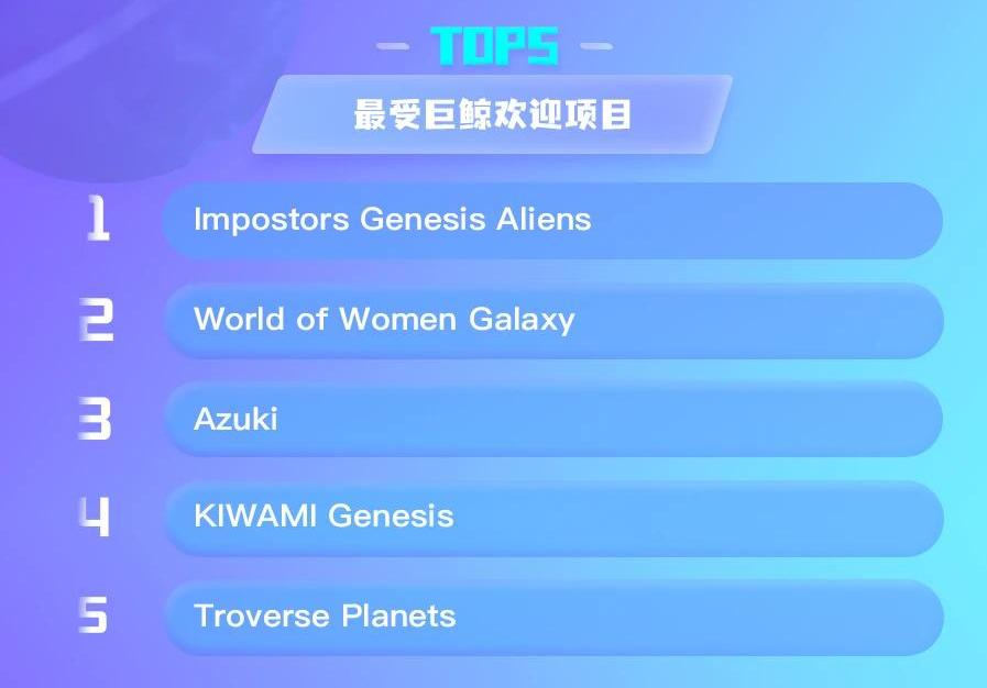 最受巨鯨歡迎項目排前五的分別是:ImpostorsGenesisAliens、WorldofWomenGalaxy、Azuki、KIWAMIGenesis和TroversePlanets。