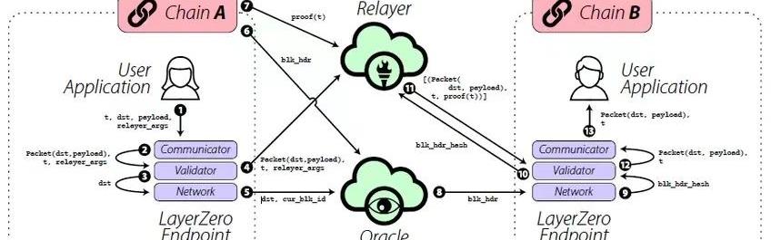先別慌,我們還是讓小海豹來翻譯上圖。有幾件事你要先弄清楚:海豹A和B基本上代表上層的用戶應用程序,它們與來源鏈和目標鏈上的LayerZero端點進行對接;預言機和中繼器作為海豹助手將各司其職,它們的工作獨立進行,以提高整個系統的安全配置文件;預言機是巫師海豹,中繼器是頭綁喇叭的海豹;為了易懂,我們特意模糊了一些細節,比如端點的情況,但核心設定不變;我引用區塊ID作為“換魚請求發生的時間”。