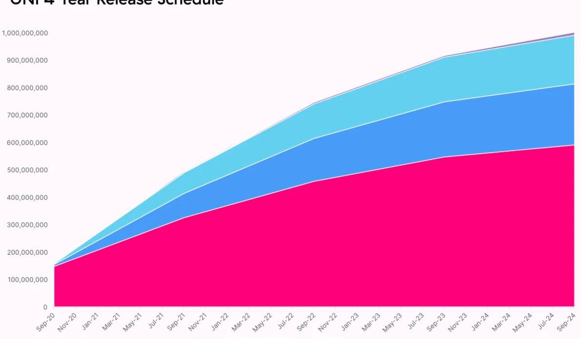 代幣的分配方式一定程度上反映了項目去中心化的程度。UNI初始發行的UNI將按照60%在社區,21.266%給團隊,18.044%給投資人,0.69%給顧問的分配方案。后三者都設置了4年的歸屬期。其中社區的6億枚已空投了1.5億給老用戶,還通過4個池子各500萬的流動性挖礦獎勵釋放完成,剩余4.3億枚也將通過逐年遞減的方式在4年釋放完畢。