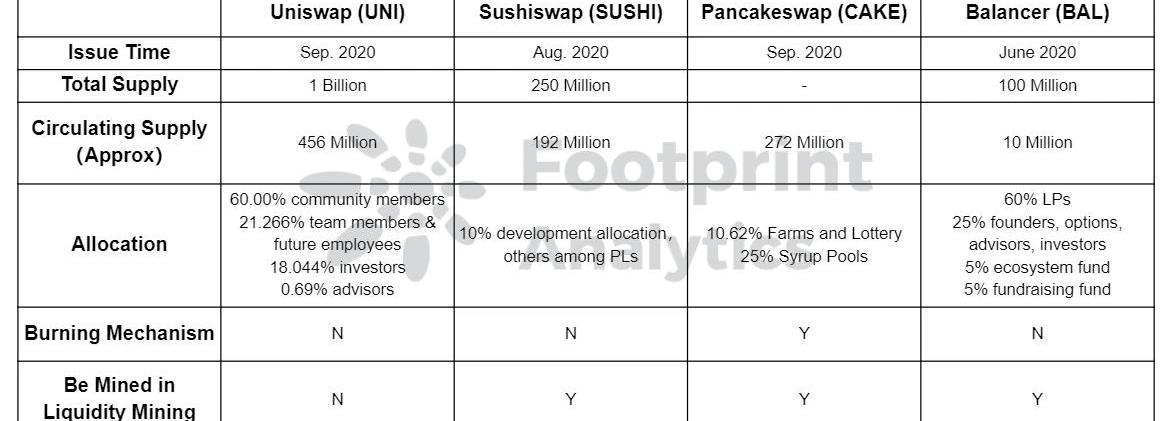 4者上線最早的是作為AMM模式的開拓者Uniswap,于2018年11月。但它2年后才發行了tokenUNI,成為這4個項目中最晚的一個。Balancer、Sushiswap、Pancakeswap都在2020年分別發行了自己的token。UNI從2020年9月UNI將用4年完成初始10億枚的發行量,4年后按照每年2%的通貨膨脹率增發,目的是為了確保UNI持有者能繼續在Uniswap中參與和貢獻。SUSHISushiswap基本復制Uniswap的核心設計,但它上線便發行了治理token。2020年8月上線時本不限發行量,后經過社區投票修改為最大2.5億。到2023年11月將通過流動性挖礦全部釋放完成,在此之前會按月減少區塊獎勵。CAKEPancakeswap是建立在BSC上的DEX。為了保持LP能一直獲得激勵,CAKE不設置硬性上線,但它并未像UNI上線就遭受拋售壓力主要歸功于它的通縮機制。在源頭上,通過減少每個區塊鑄造的CAKE數量減少產量,發行后還設置了一系列銷毀機制,如購買彩票時將拿出20%的CAKE銷毀。據FootprintAnalytics的數據,當前CAKE的流通量為2.72億枚。BAL2020年3月Balancer正式上線,6月開啟流動性挖礦。它的特色在于LP在提供流動性時可自定義池子中資產的比例,且支持多種資產的做市組合。BAL最大供應量為1億。每年通過流動性挖礦發放750萬枚BAL,按此速度需8.67年分配完成。BAL的釋放速度相對其他項目慢很多,這種方式可以降低它在二級市場的拋售壓力。分配情況